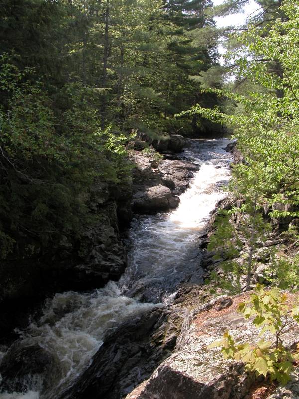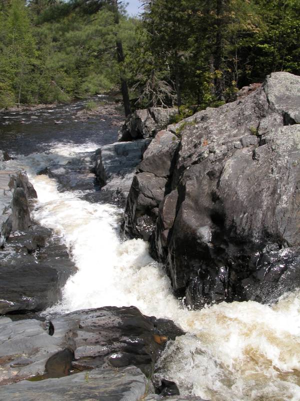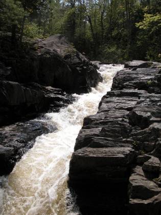The falls consists of two chutes where the river is constricted to a narrow channel. The second is the larger of the two, and the river drops about 15 feet in a thirty foot stretch while taking a turn.