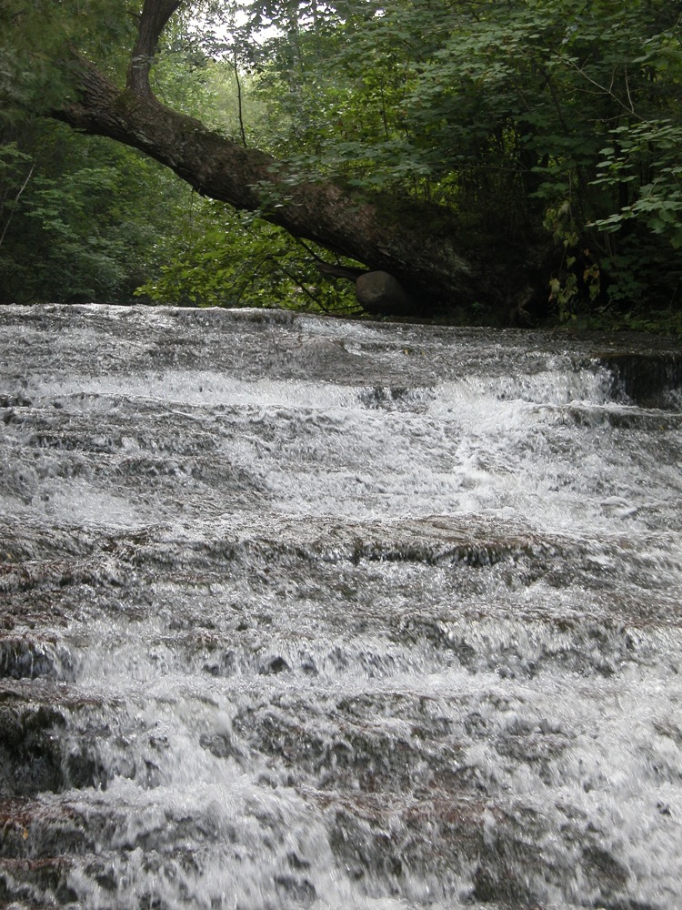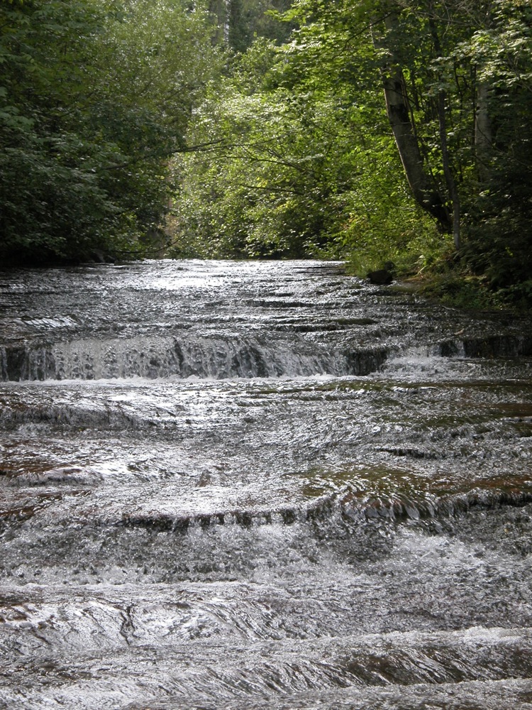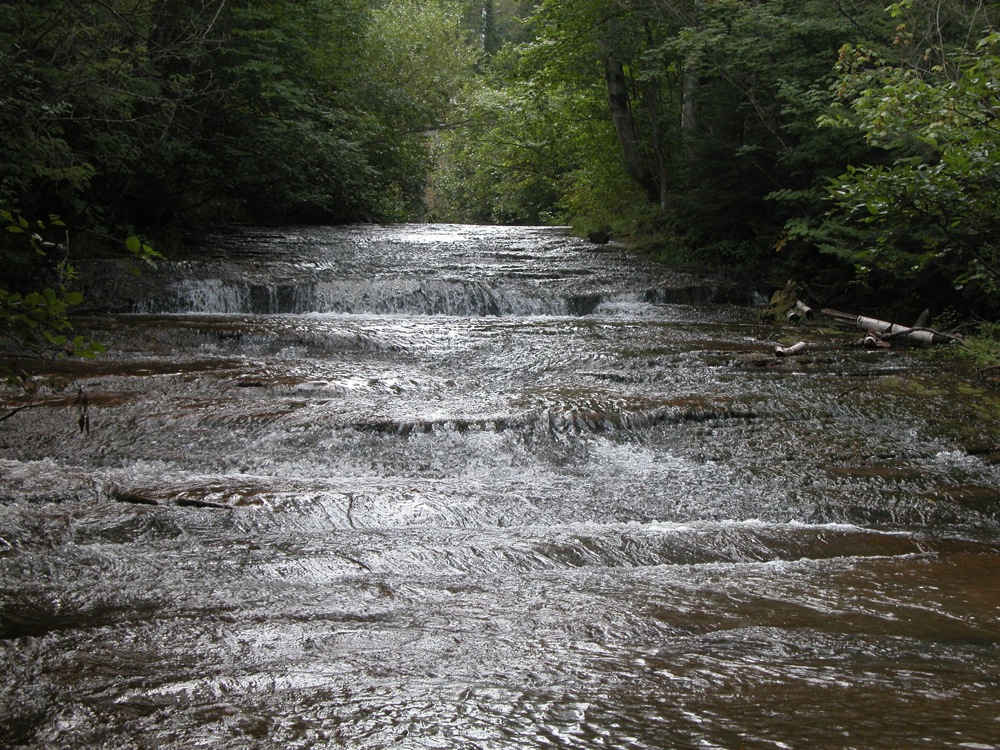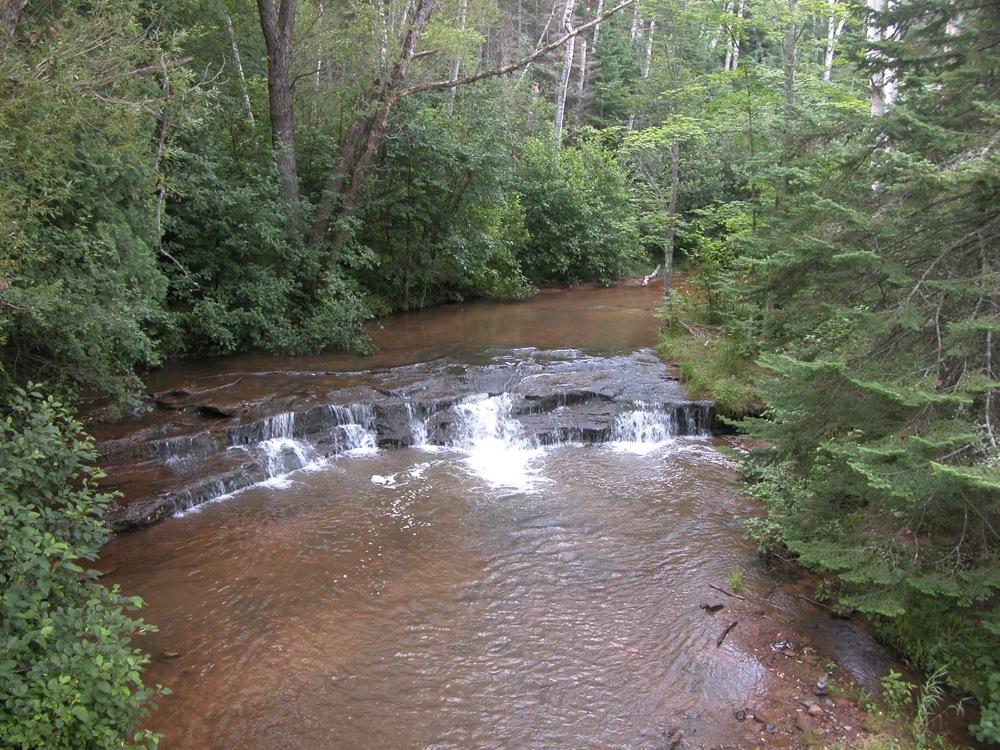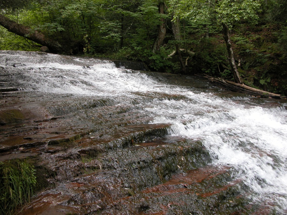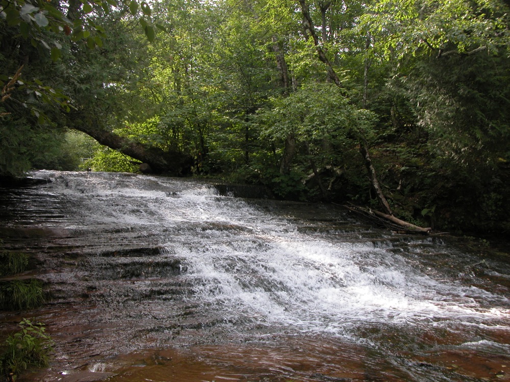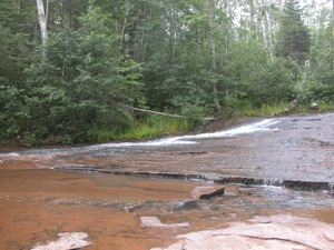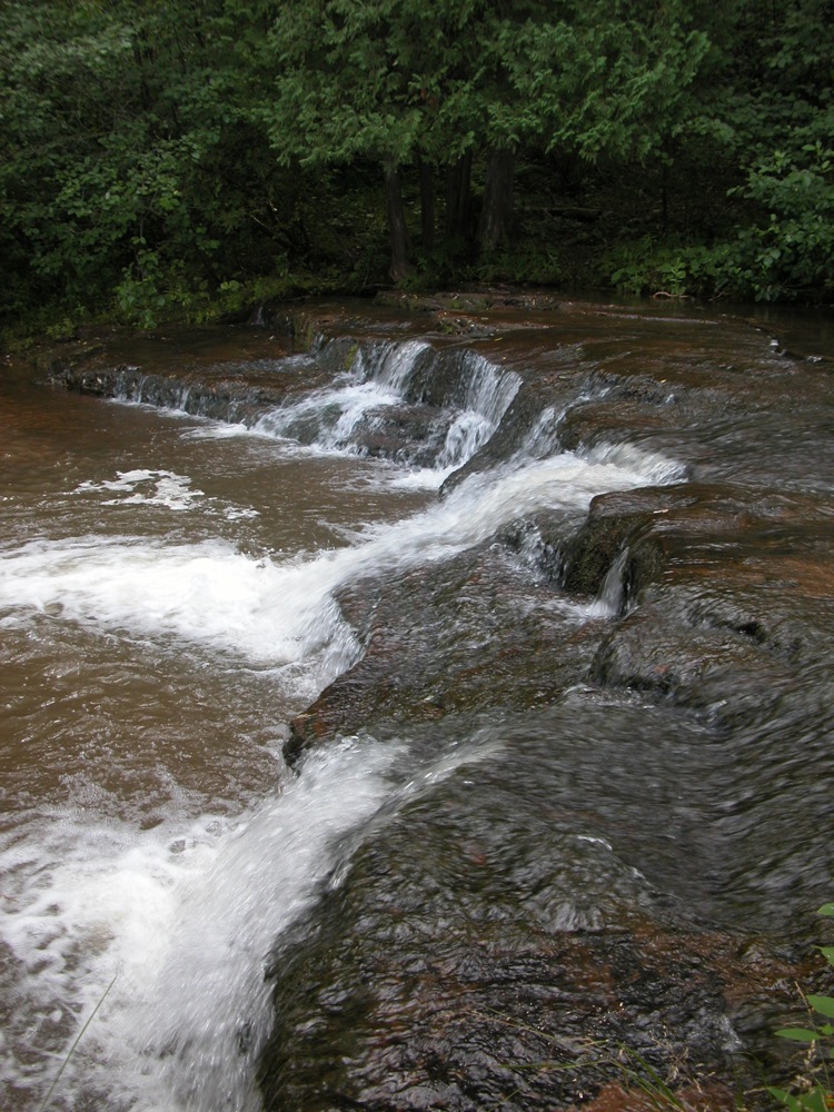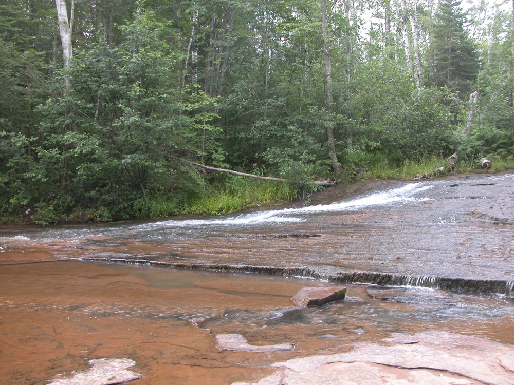 The falls is located upstream and downstream of the bridge over the river on Siskiwit Falls Road. One of the smaller drops, a 3 foot ledge, is clearly visible from the bridge. A short trail leads from the bridge down to the brink of the falls. I think many people think this is all there is to Siskiwit Falls. Fortunately they are incorrect.
