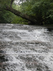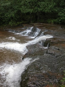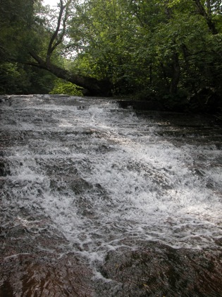 A 5 foot high slide is located just upstream around the corner. In August the water was spread very thinly over the rock. I imagine this drop is much more scenic with more water. Trails lead to the drop from the drop by the bridge, and directly from the road.