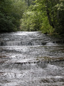 The best drop is located downstream of the bridge. On the east side of a bridge you will find a well trodden trail down to the river. This passes a number of small drops and rapids, another slide in the 5 foot range. The last, and best drop, is less than a 1/4 mile from the bridge. The trail continues a bit farther and ends at the river.