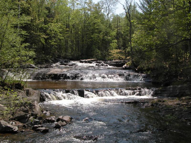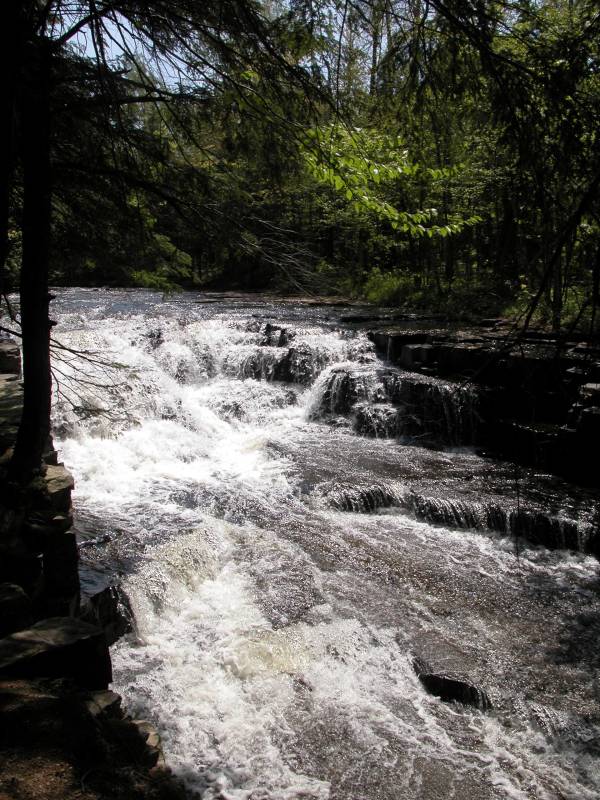 If you continue upstream past the falls a few hundred yards you can find two smaller falls, Slide Falls and Ecstasy Falls (so named by kayakers). About 3 miles upstream you can find Quartzite Falls, Black Slate Falls and more unnamed drops. These falls can be reached by car. From Skanee Road head south on Avron Road, which is just west of the Slate River, for about 3.3 miles. Take the road to the right, which will soon cross the Slate River. A well groomed trail will lead you downstream to Quartzite Falls. Black Slate Falls and other drops are upstream and you just have to make your way along the river.