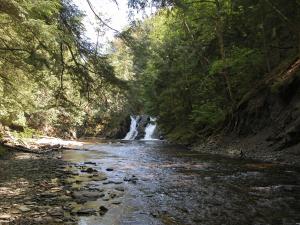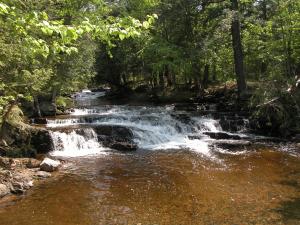 The falls are located along Skanee Road between L'Anse and Skanee, about 10 miles east of L'Anse. There is a sign marking the Slate River, so the falls are easier to find than some. The bridge over the river is just past Arvon Road. A few hundred feet east of the bridge there is a two track that leads to a small turn around. A rough trail starts here that follows the east side of the creek. The falls are about 1/2 mile from the road. You will have to cross the river at some point. There are also ATV trails on the west side of the river that lead down to the river. From here you can work your way up the river, crossing it when convenient. A rough trail has been left behind by curious visitors.