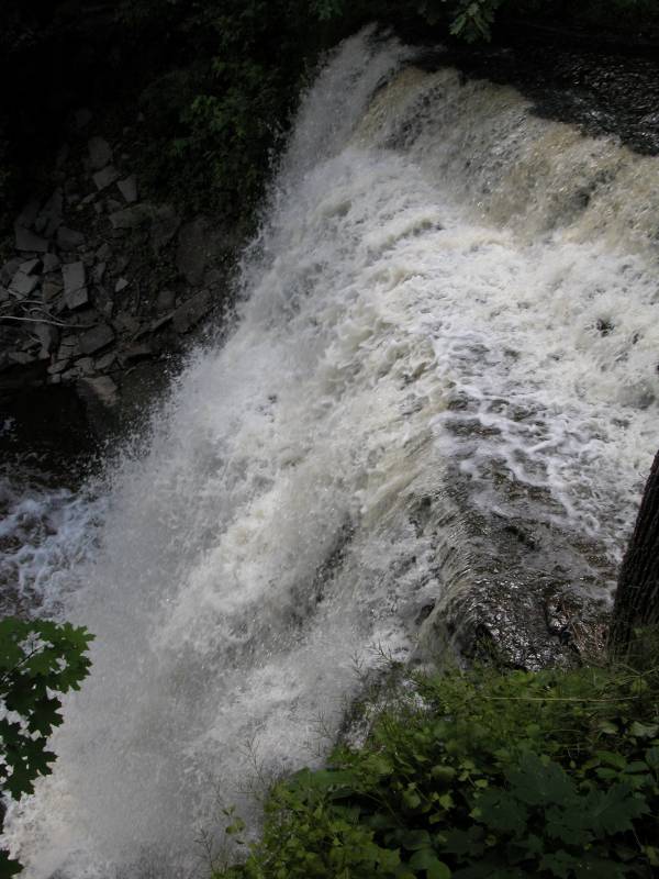 To reach Smokey Hollow Falls exit the 403 at Hwy 6 and head north west. Turn right onto Hwy 5, and then turn right on Mill Street. The park is on the right as you descend the escarpment. There is a viewing platform. If you follow the Bruce Trail down stream you can easily get into the gorge and to the base of the falls.