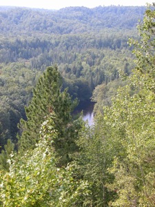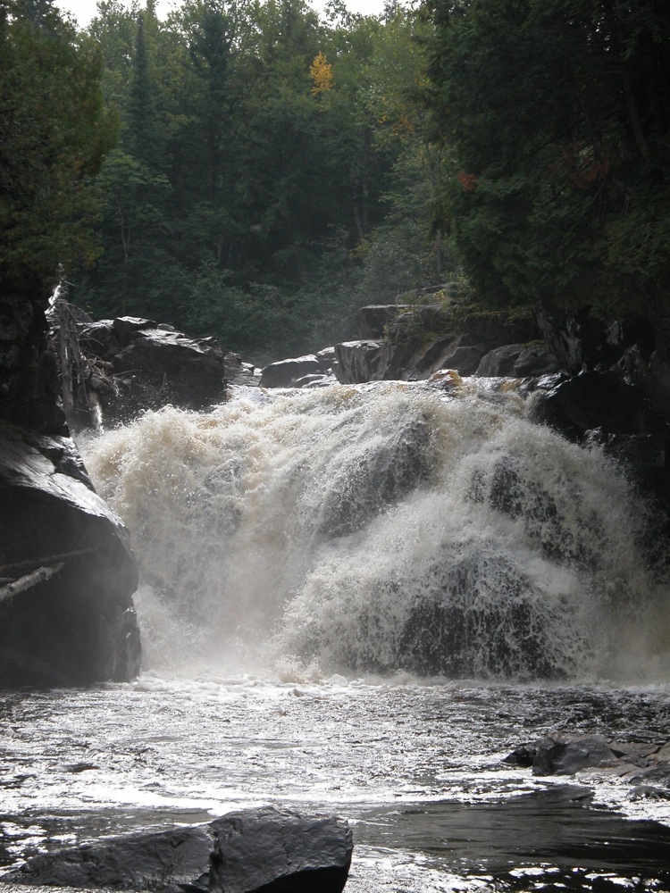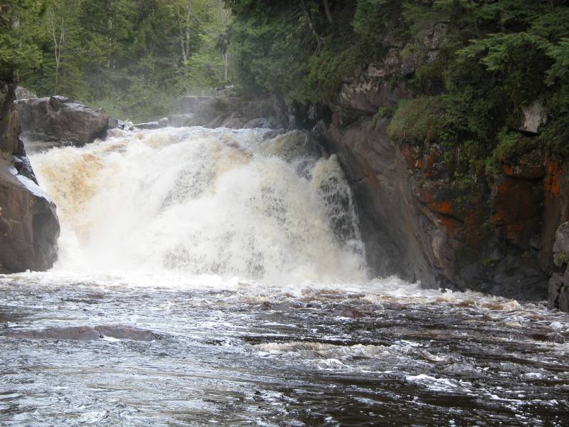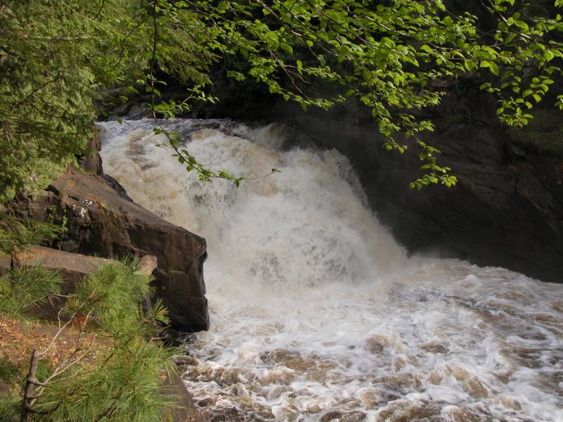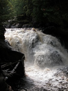 Sturgeon Falls is located in the Sturgeon River Gorge Wilderness in Ottawa National Forest. The Sturgeon River has carved out a deep, forested gorge, that is 300 feet deep in some places. The falls are located deep in the gorge. The drop is only 25 feet, but the river is very powerful. Above the falls the river is well over 100 feet wide. It then narrows into a chute only about 20 feet wide before shooting over the falls, spraying mist in all directions.