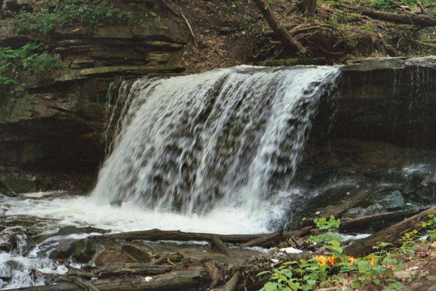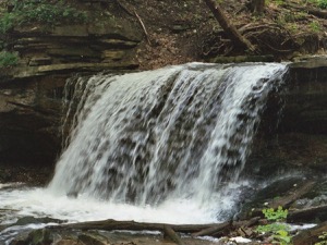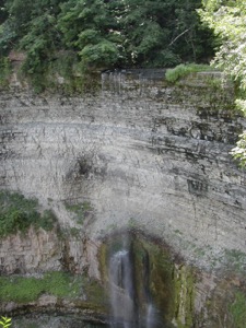 At the bottom of one of the cascades, the creek from Tews Falls enters Spencer's Creek on the far side. You will have to wade across the creek. Be careful, the currents are strong, and the rocks are hard on the feet. You can then walk up the east side of the creek to the base of Tews Falls. This is not a maintained trail, and the going is a bit rough at some points. Along the way you will pass the 10 foot high lower Tews Falls. The entire trip, from Websters Falls to the base of Tews falls, will take about one hour.