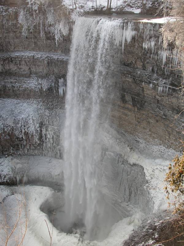 Tews Falls can be reached from Webster's falls via a 30 minute hike along the Bruce Trail, or by a 5 minute drive down Harvest Road to the Tews Falls parking area. See Webster Falls for directions. There is a view area at the top of the falls that can be easily reached from the parking area.