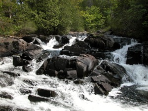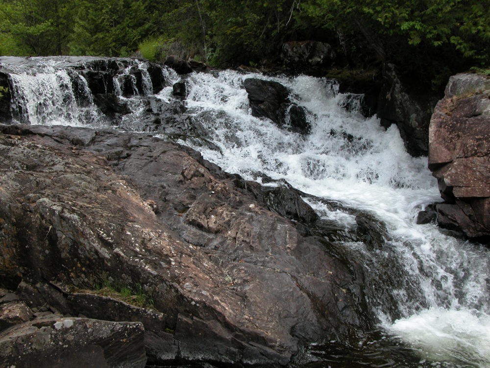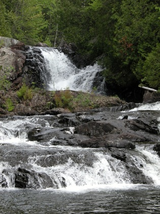This is one of two wild waterfalls located on the Thessalon River between Carpenter Lake and Slide Lake. As far as I know neither of these falls has an official name. This is the upper of the two, and so I am calling it Upper Thessalon Falls. The falls consists of one big steep drop of about 5m, with some smaller cascades below, and a long series of cascades above the main drop. You can climb up the side of the big drop and walk along the river to see all the cascades up to the outlet of Slide Lake.