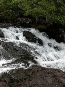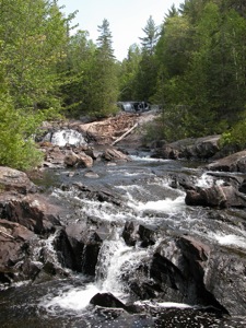 The Lower Falls is 2km downstream. Maps show a waterfall on a tributary of the Thessalon River on the west side of Carpenter Lake. There are probably other waterfalls hidden away in this wild and rocky area. Grindstone Falls is only 17km away as the crow flies, but to reach it by car you would have to drive over 100km on very rough roads, or head all the way back to Hwy 17, then east and north again for a total of 160km.