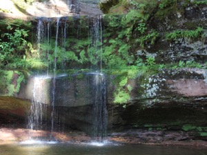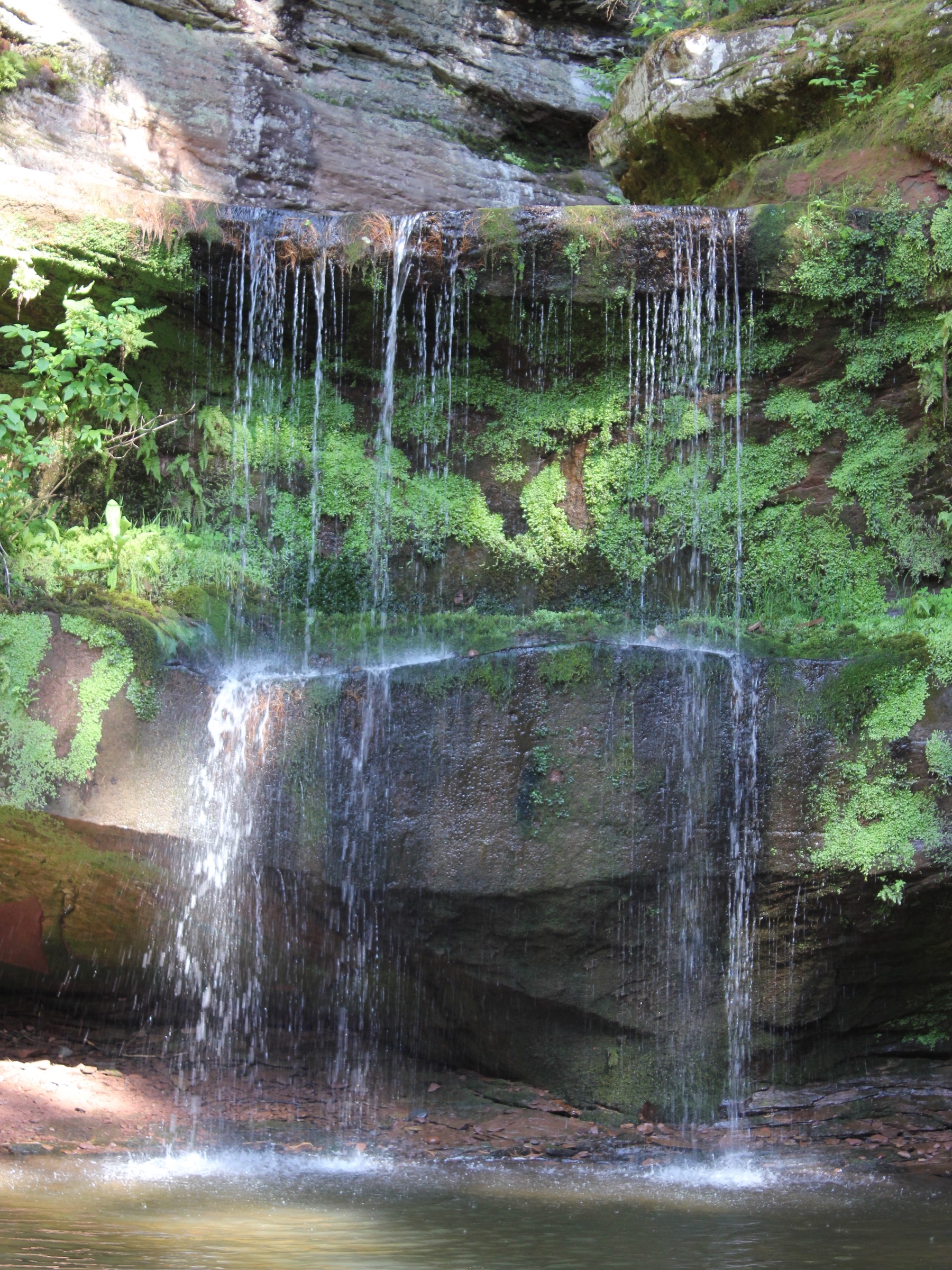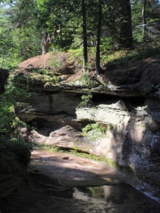 Twin Falls is located in the town of Port Wing Wisconsin, about a mile from the shores of Lake Superior. Larson Creek has carved a short, but impressive gorge through the sandstone. This is the same rock responsible for the sea caves found at the Apostle Islands. There are two drops, but they are not really twins. The lower drop is about 12 feet high, and is a plunge. The upper drop is a steep cascade that is just a few feet high.