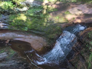 There is a viewing platform above the falls on the left from which you can get an impressive view of the gorge, but not a very good view of the falls. A staircase ascends the right side of the orge, and the trail continues upstream along the gorge rim to the upper falls. It is possible to cross the creek above the upper falls, but it requires lifting yourself over some rock.