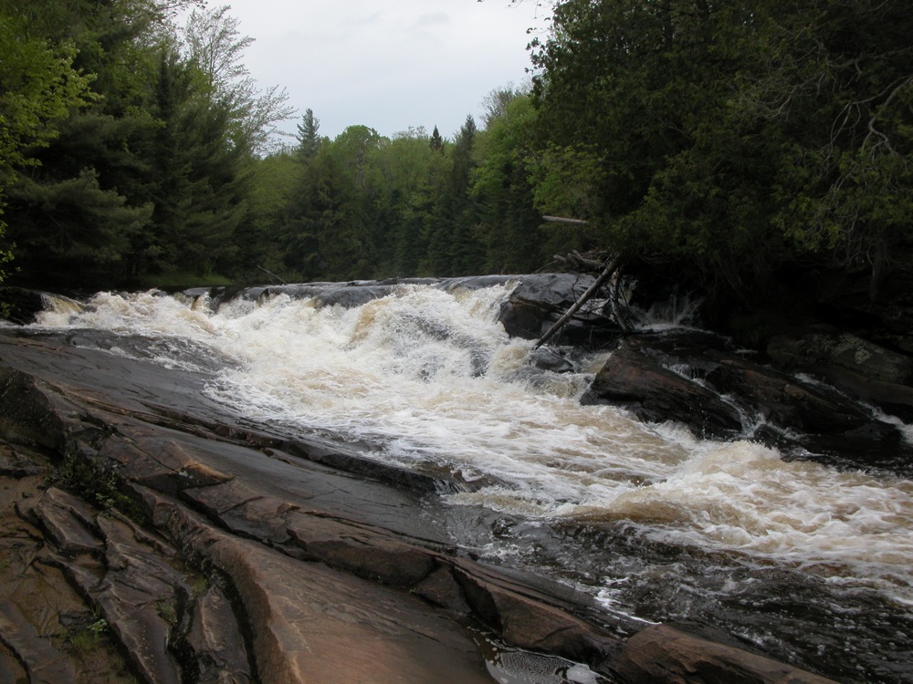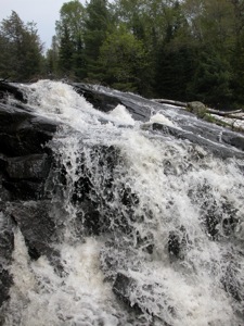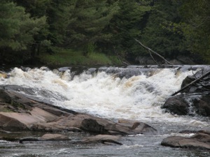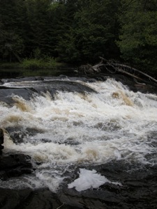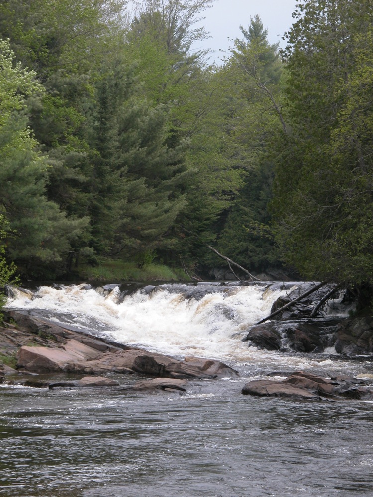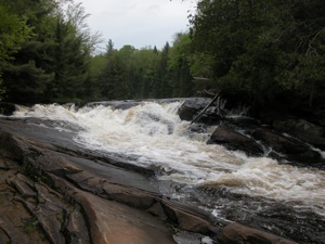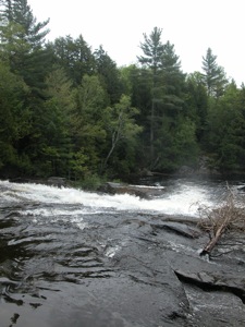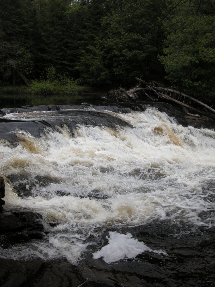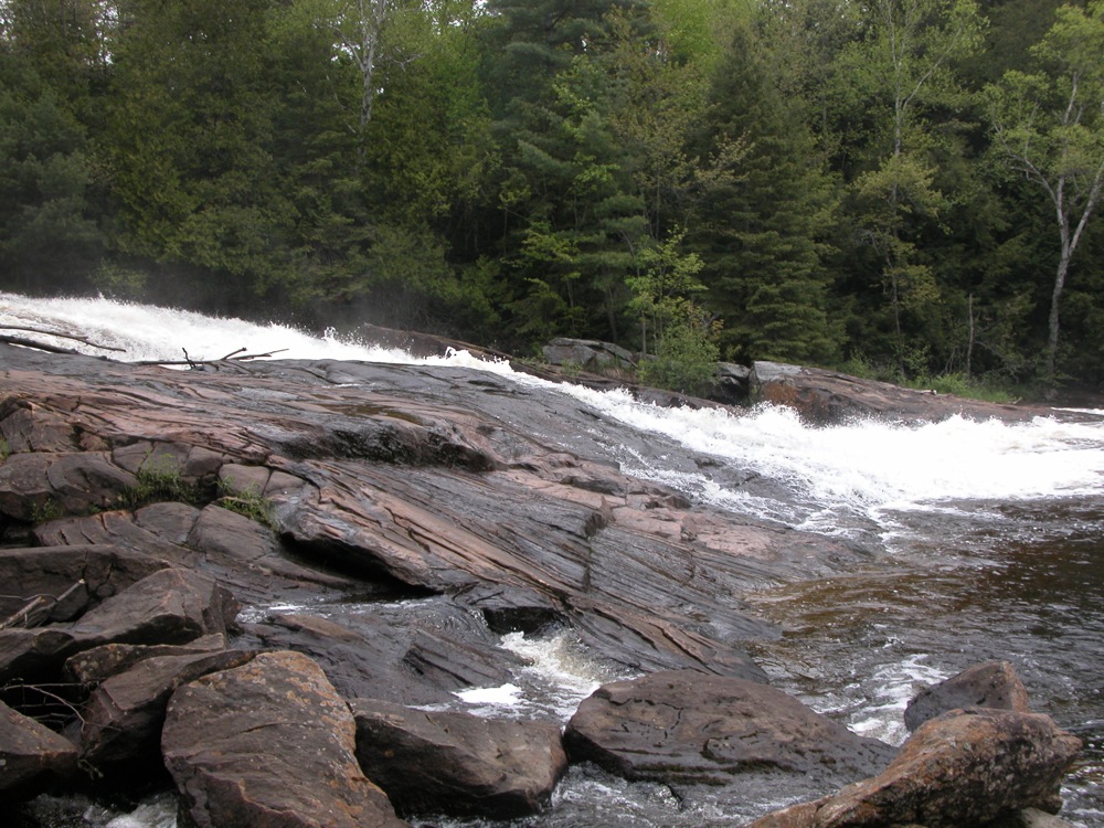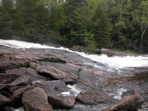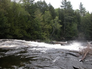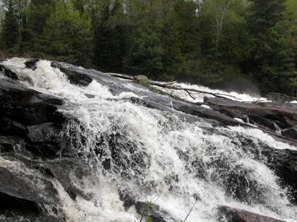 According to the Bracebridge there are several waterfalls on the Black River near the village of Vankoughnet Ontario. High Falls is, presumably, the highest of a number of falls. High Falls is about 4m high, and slides over the rocks at about a 30 degree angle. Due to the way the river is angled, you cannot get a full view of the falls from the accessible west side of the river. To get a full view of the falls you would need a canoe. You also need a canoe to see most of the other falls on the Black River. One exception is the 2m Lower Falls, which is a short distance downstream. This waterfall is clearly visible from the road.