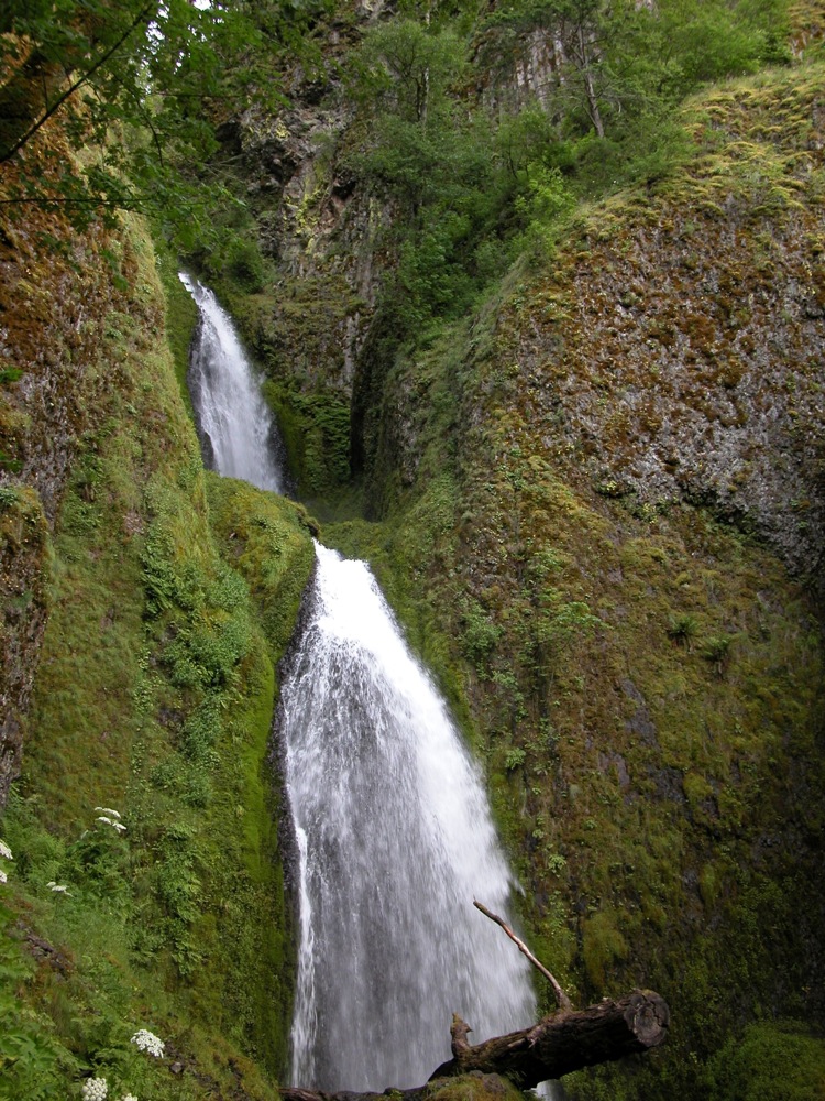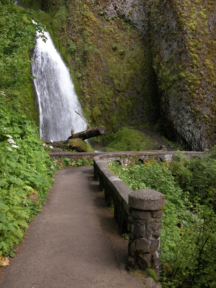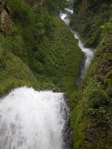 The waterfall is visible from the parking area. From here you can see three or four of the drops. A trail leads up to a foot bridge that crosses just below the last drop, which is about 25 feet high. Up close you can only the last two drops of the falls. The trail continues up the gorge wall, eventually reaching Fairy Falls. You can continue hiking all the way to Multnomah Falls.