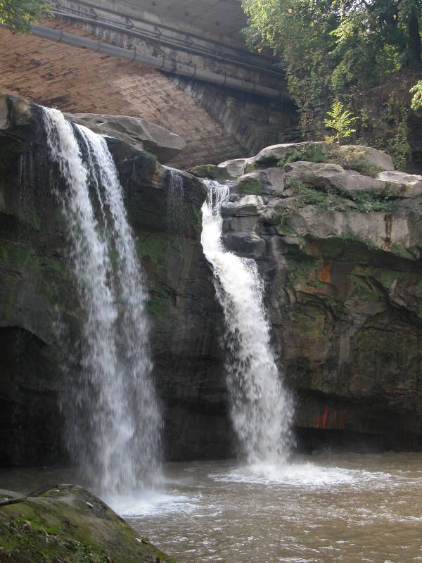 Sadly there is a lot of garbage in the gorge below the falls, such as tires, oil drums and the bits and pieces of shopping carts. This seems to be the fate of many urban waterfalls. The area smells a bit funny too. I was there after a week of rain and some sewers had overflown.