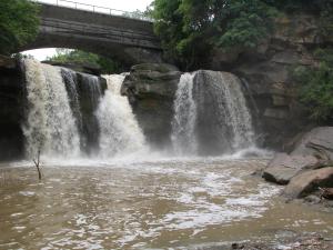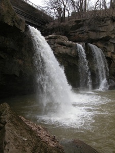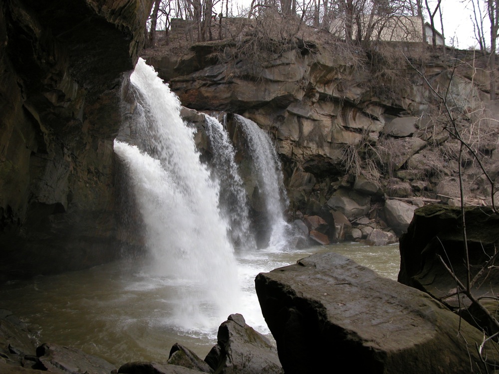 The East Falls are a mile away. There is a trail between the two falls. There are a surprising (to me anyway) number of waterfalls in the Cleveland area. The following are all within 30 miles of Cleveland: Brandywine Falls, Buttermilk Falls, Mill Creek Falls and Chagrin Falls.
