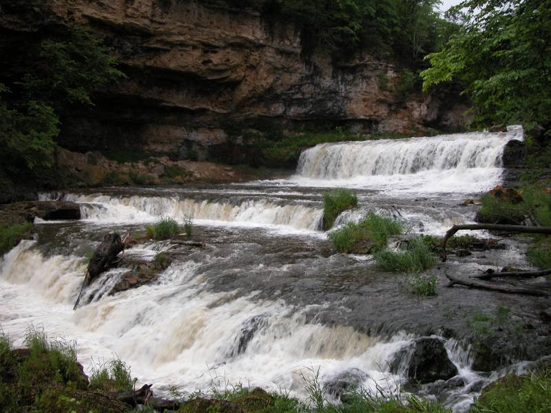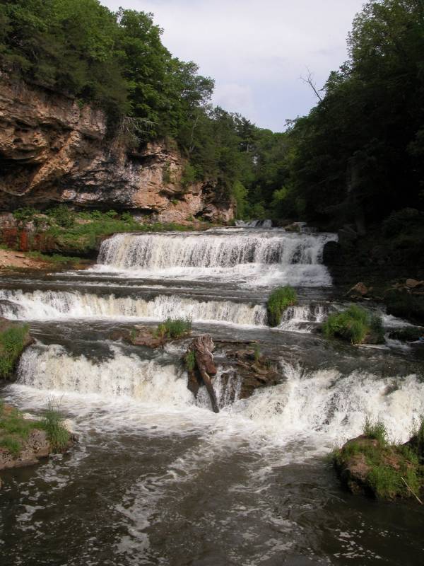 Willow Falls is located in Willow River State Park, about 10 miles northeast of Hudson Wisconsin. In my opinion either Willow Falls or Lower Potato Falls is the most impressive waterfall in the state. The falls, which is at least 100 feet wide, consists of several drops, the largest of which is about 15 feet high. The uppermost drops are only visible from the rim. This is a good sized river and creates an impressive display as it tumbles down on its way to meet the much larger St. Croix River.